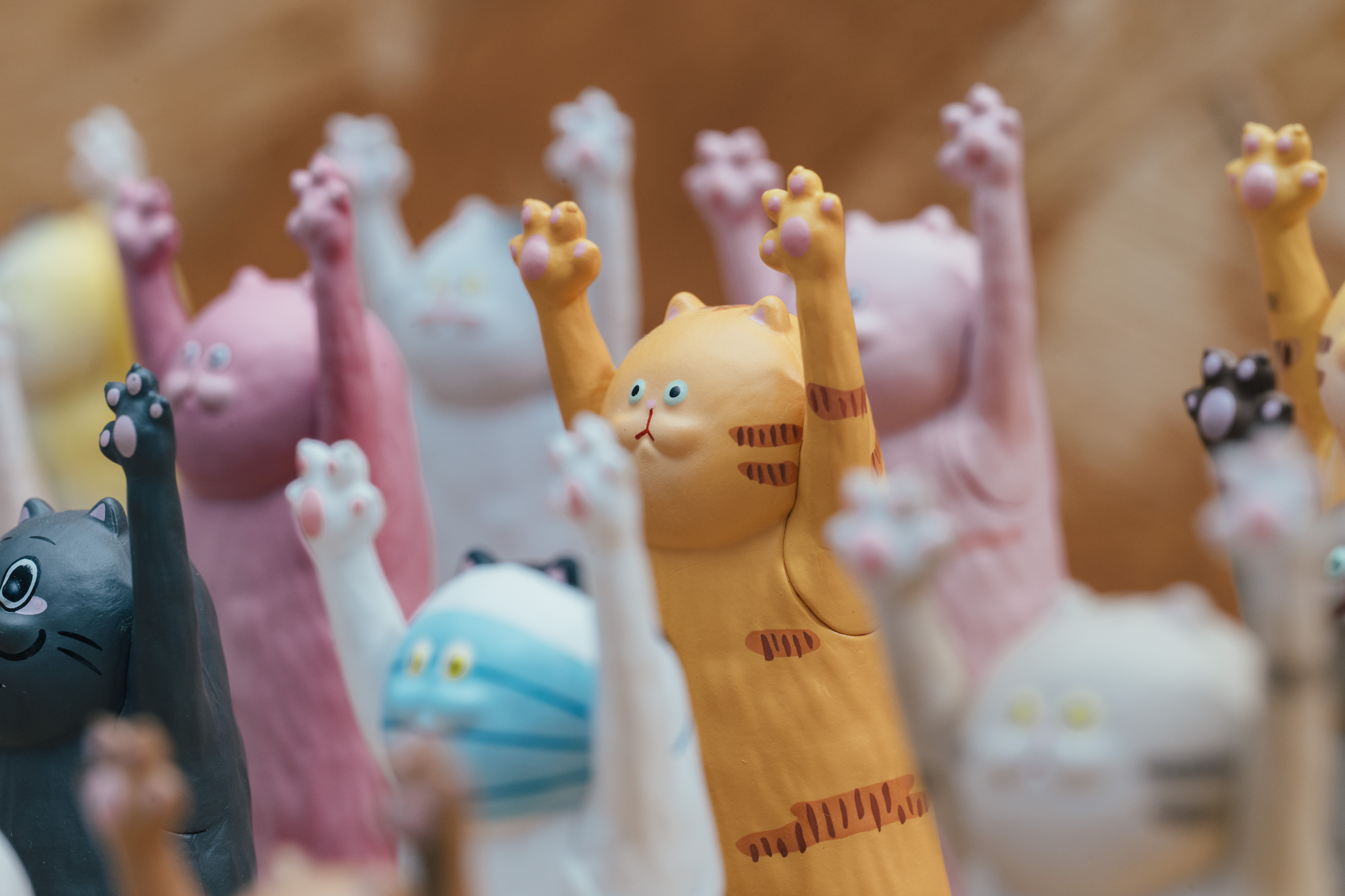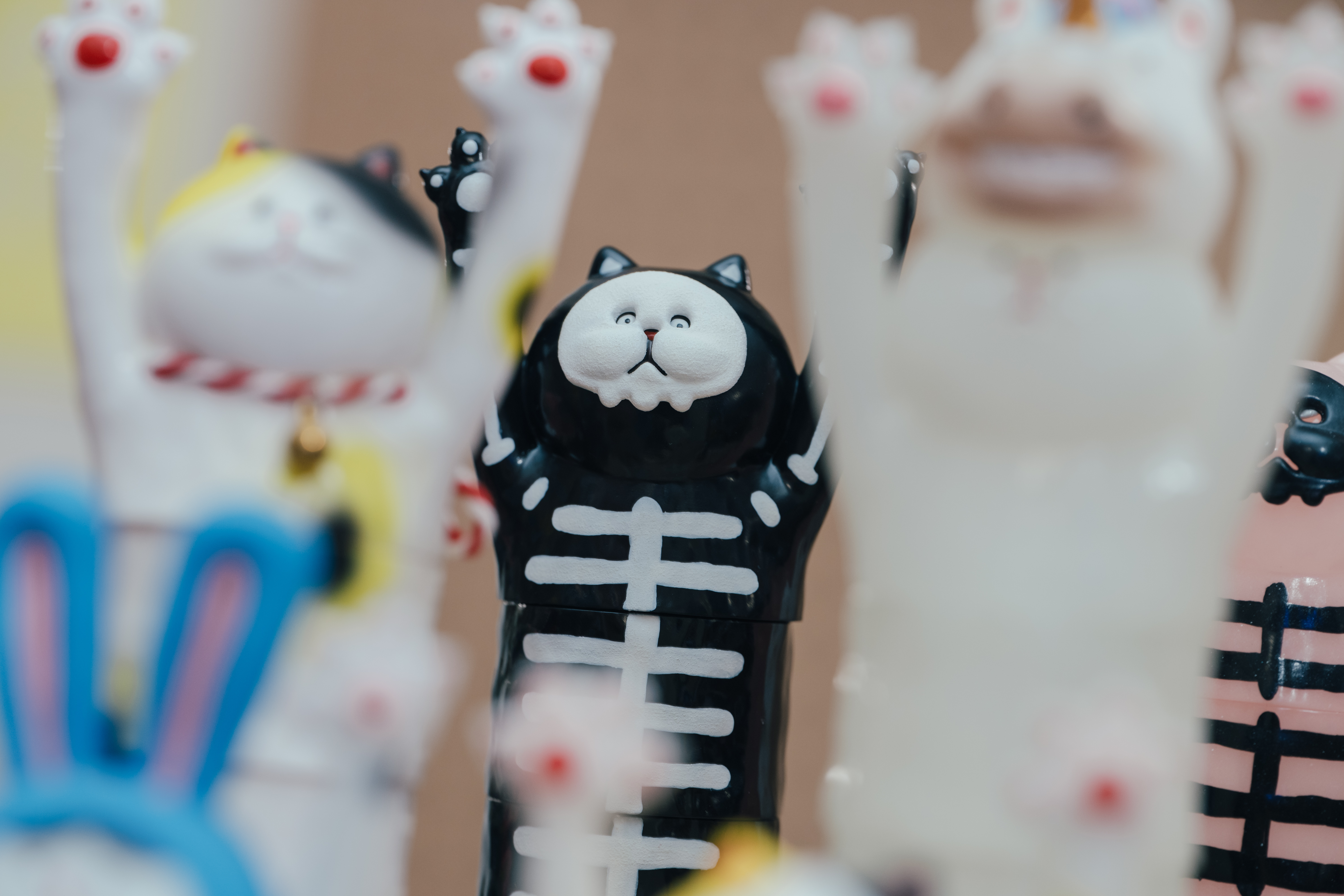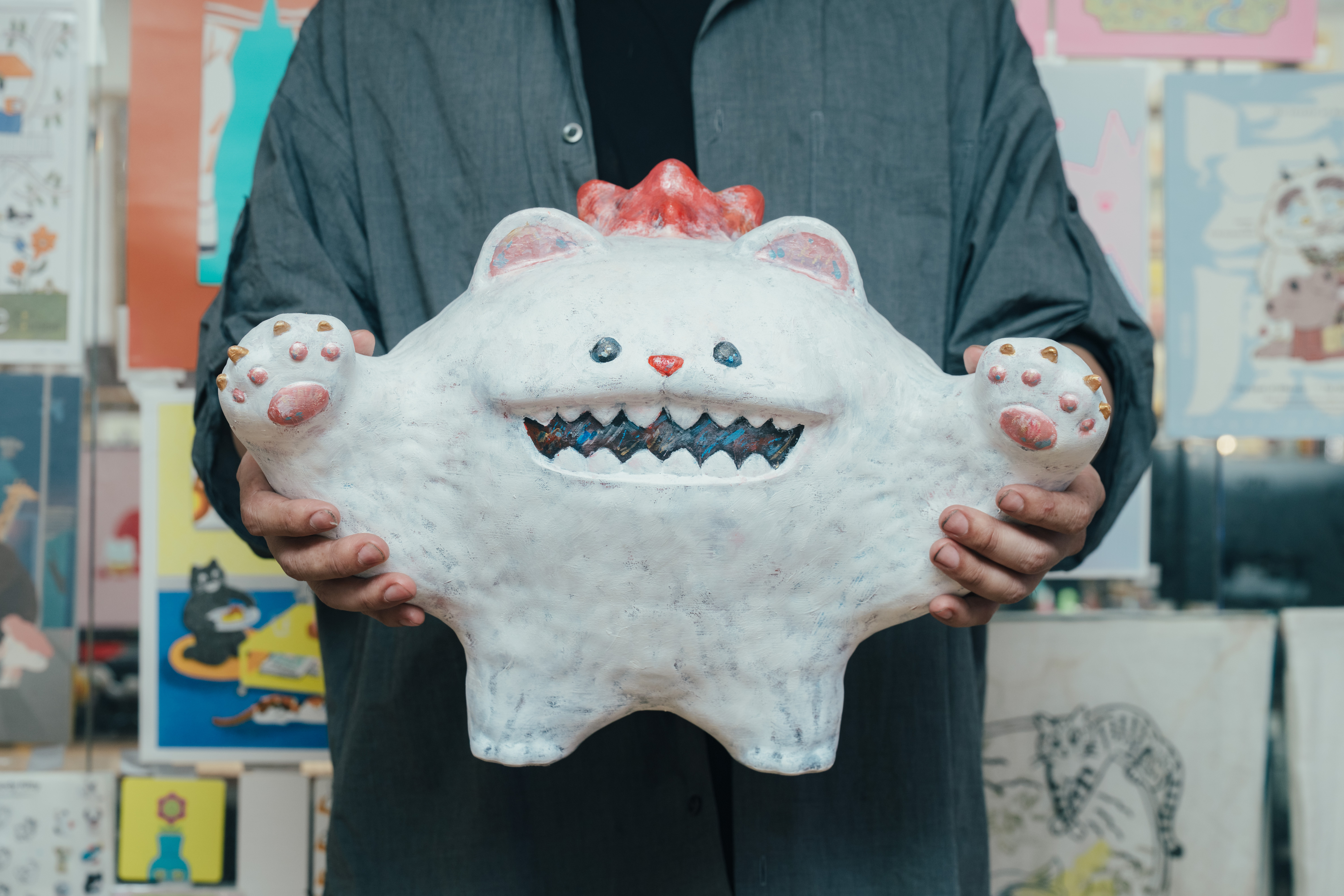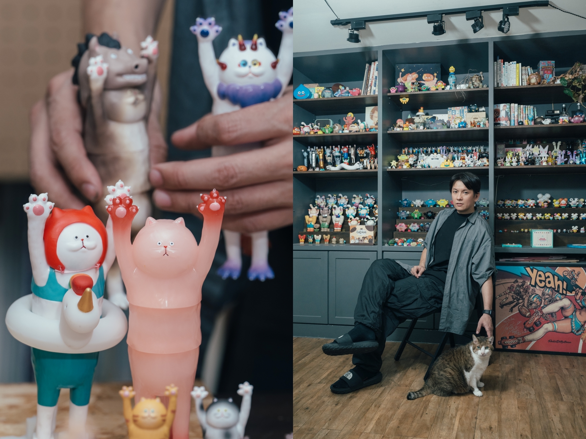 Dylan是徹頭徹尾的貓派,養貓超過數十年,還做過「貓中途」,家中貓咪的數量最高達十二隻;如今,他在工作室養著「拿鐵」與「摩卡」,兩隻不忌諱窩在一起睡午覺的喵咪。長時間與貓咪近距離相處,精準地掌握貓咪的性格與特徵,設計的每隻貓咪公仔都像是你昨天才巧遇的貓友,有人見人愛的好脾氣橘貓、化身宅急便快遞人員的黑貓,以及帶點惡趣味、全身無毛的粉紅皮皮貓等。Dylan從Skin(角色外觀裝扮)賦予每隻貓咪迥異的個性;一對對高舉的貓掌,露出圓滾滾的肉墊,召喚著所有的貓奴前來。