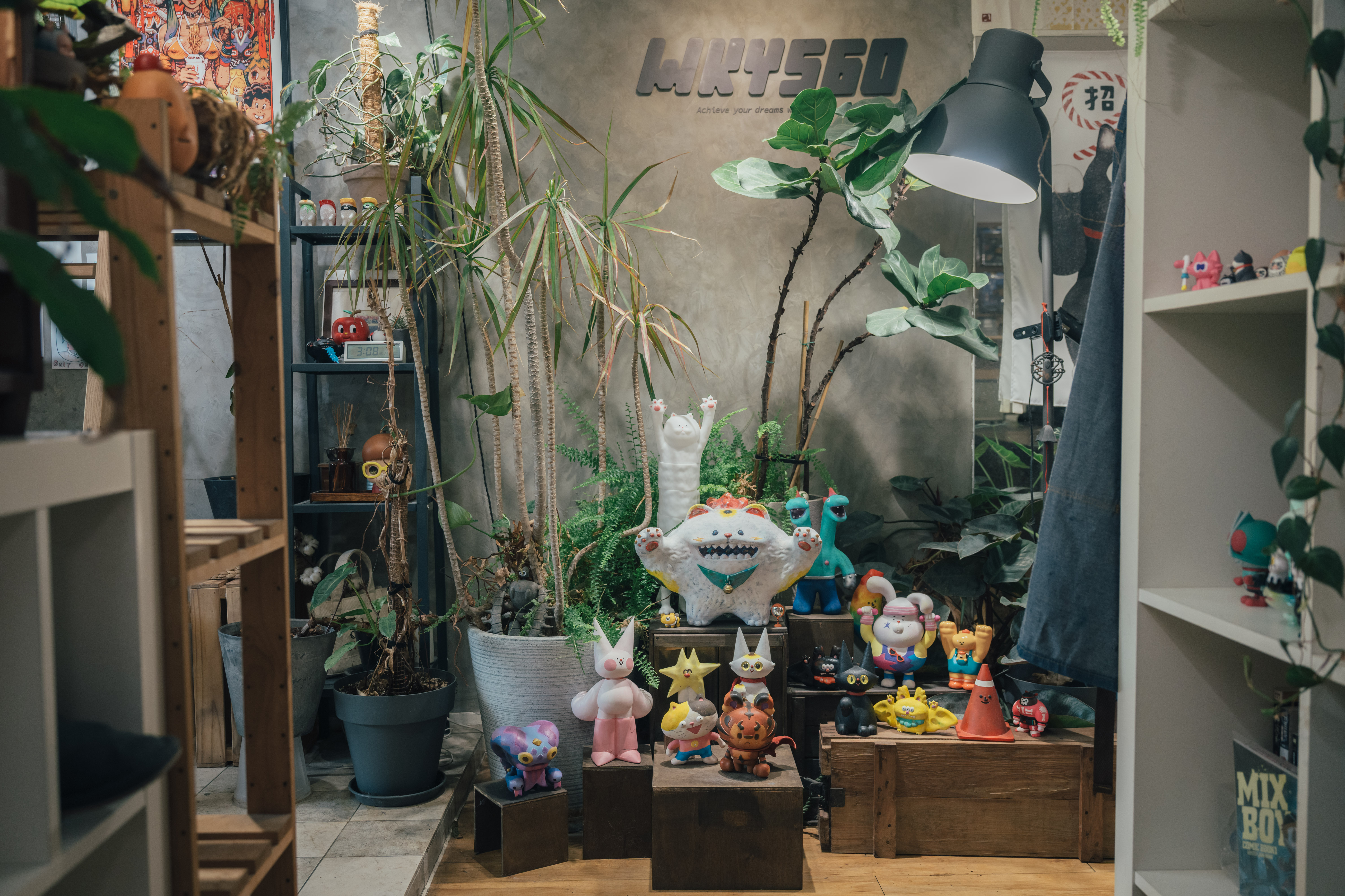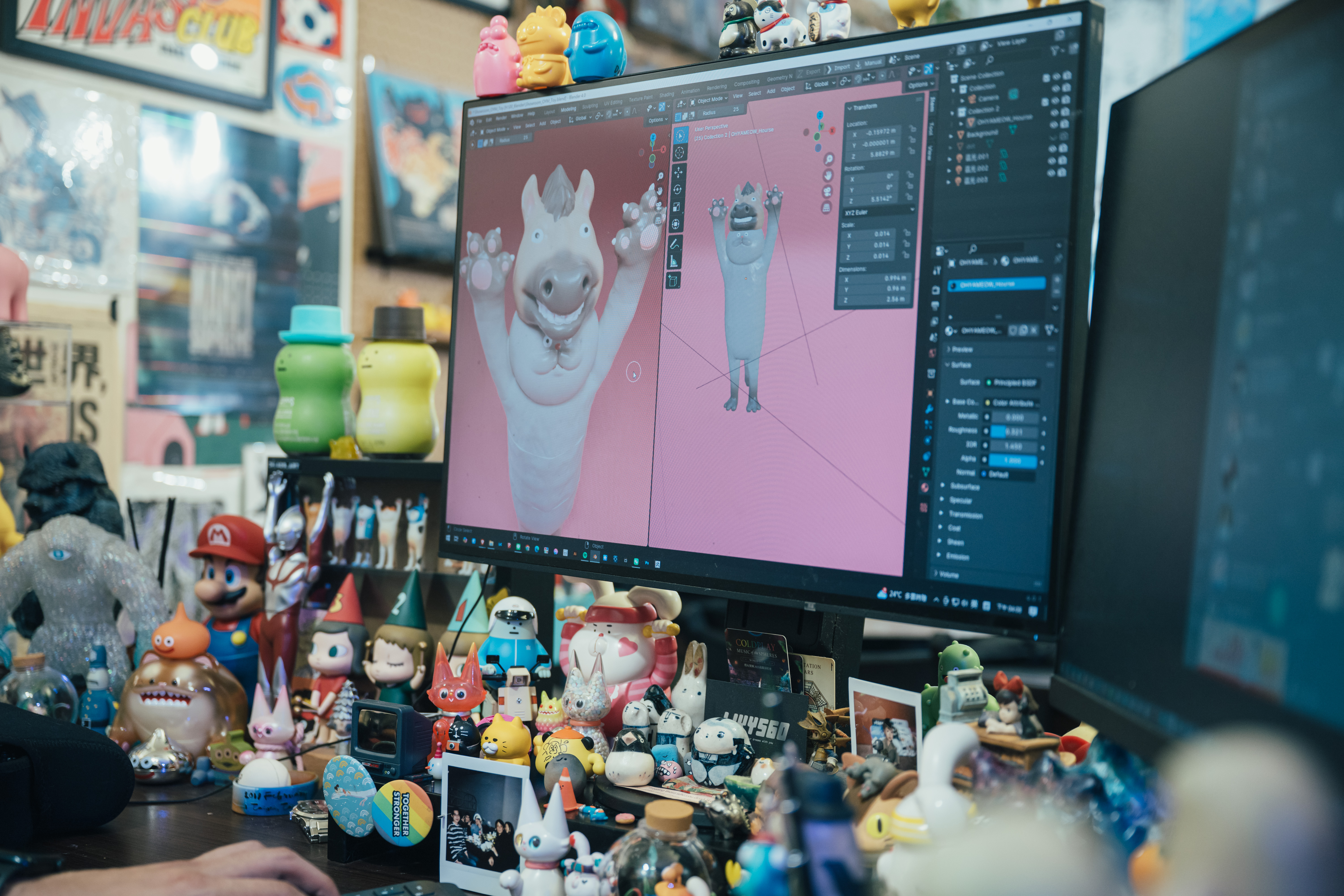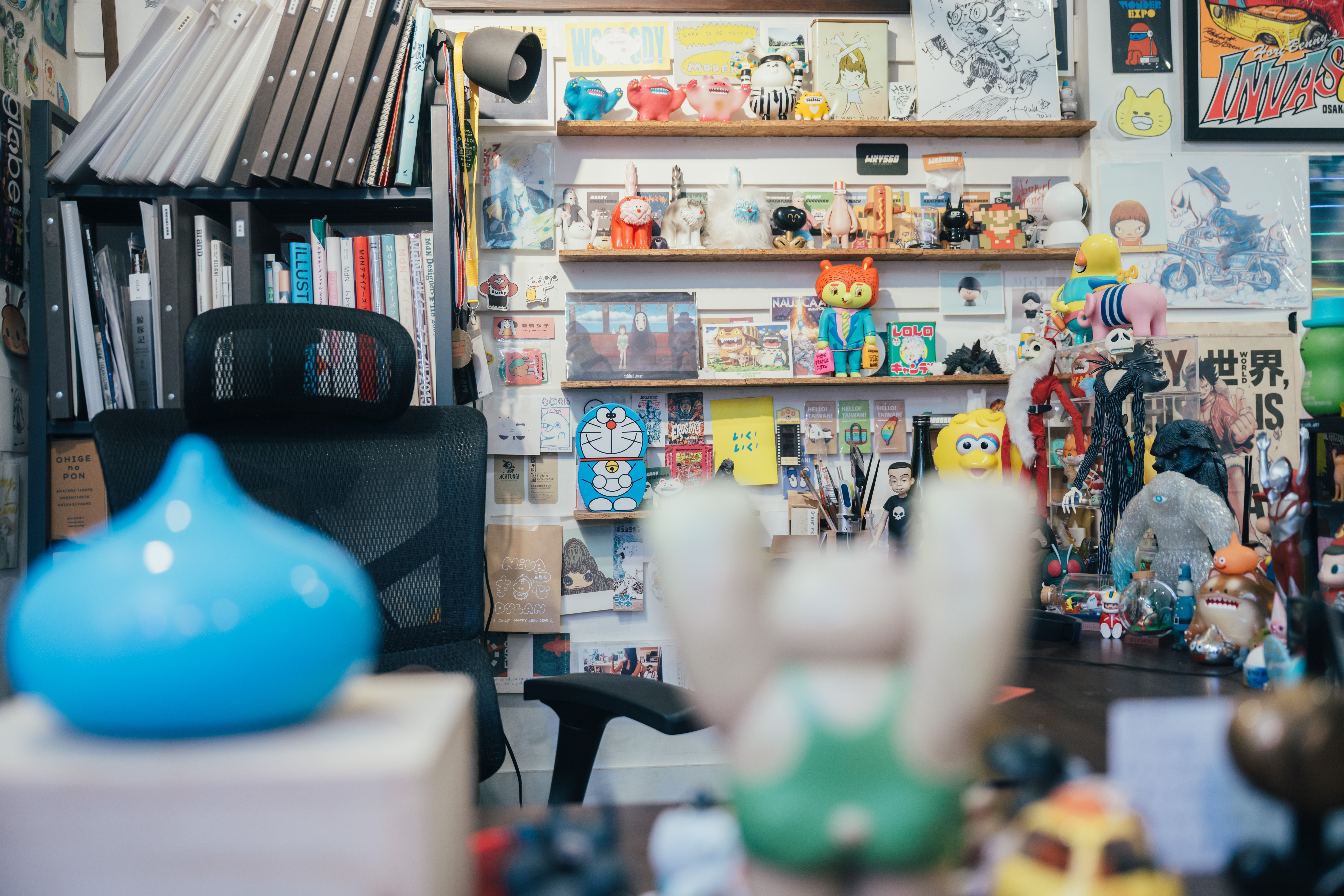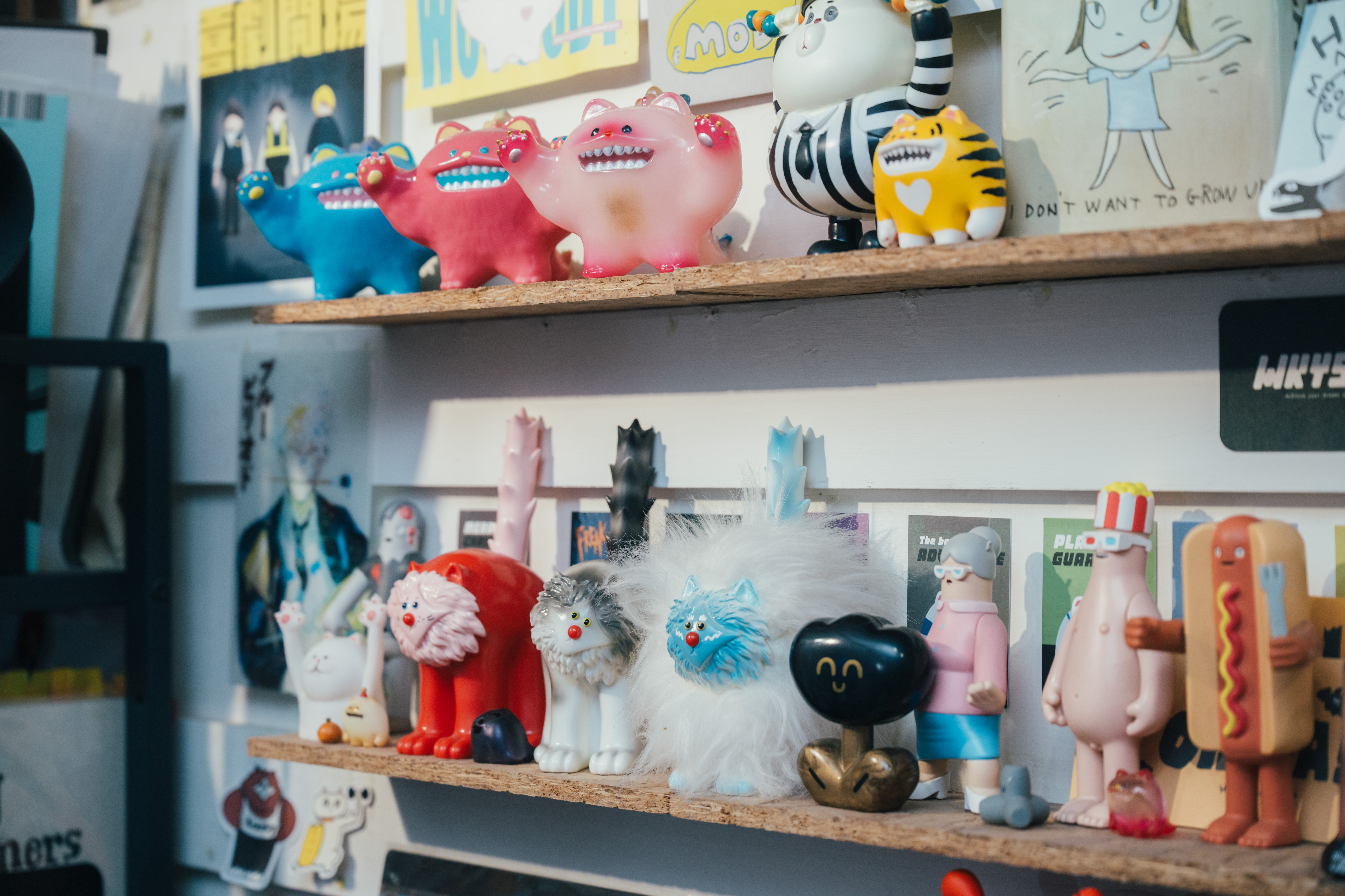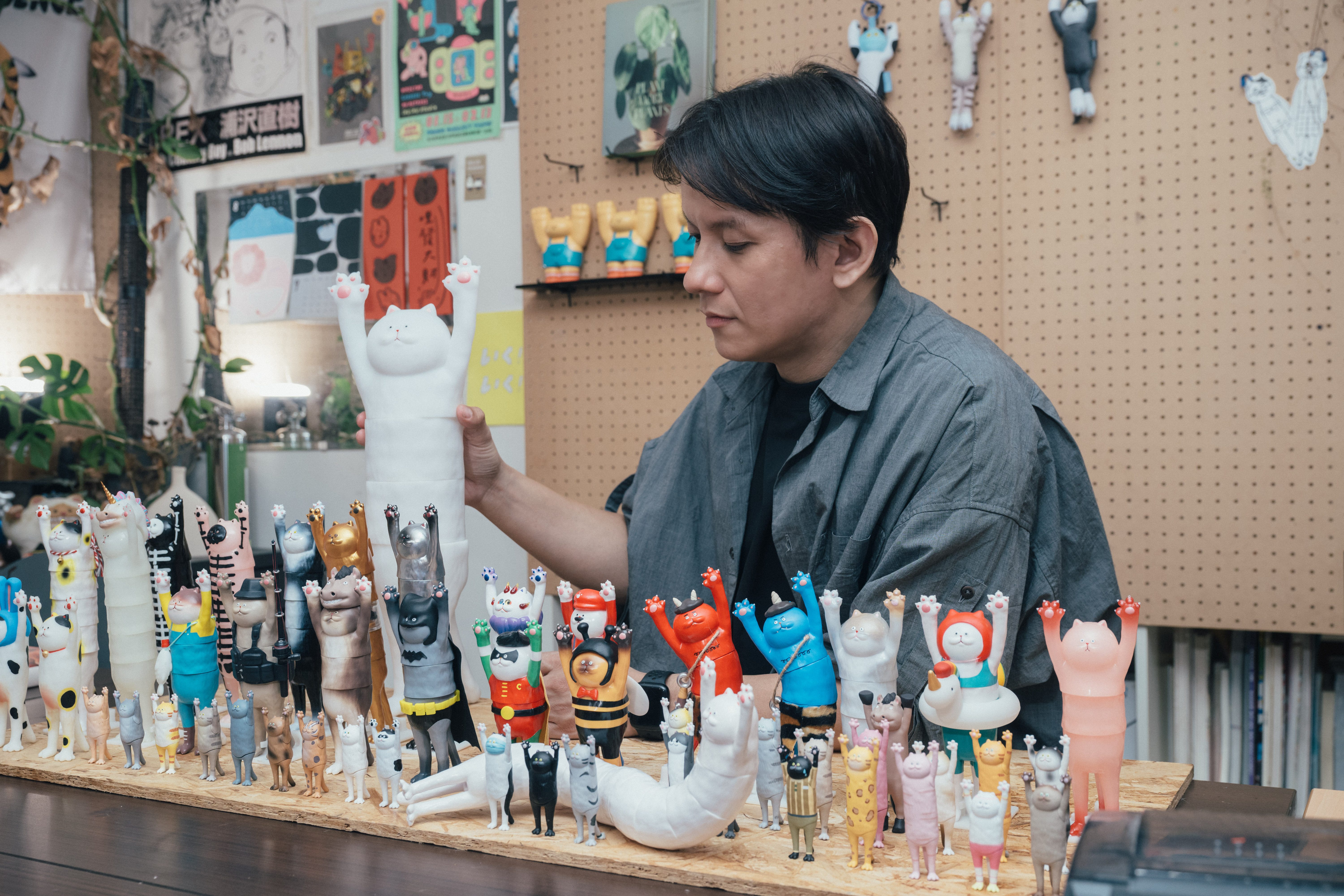至於,工作室裡玲瑯滿目、數量超過百隻的玩具公仔從何而來?一半是自己的作品,其餘的是他從國內外玩具展蒐購而來的寶貝;他的玩具店口袋名單有日本的「中野百老匯老商場」,還有台灣玩具迷的新熱點「賓王大飯店一樓老商場」。他特別喜歡上個世代出品的二手玩具,不再有新品的經典IP周邊,只要價錢合理,就會毫不猶豫地買下來,因為它們都是能帶他重返童年時光的「稀世珍寶」。他認為,這些公仔的存在都是在提醒自己:「不要忘了初心,保持那個愛玩、愛創作的自己,好好享受創作的過程。」