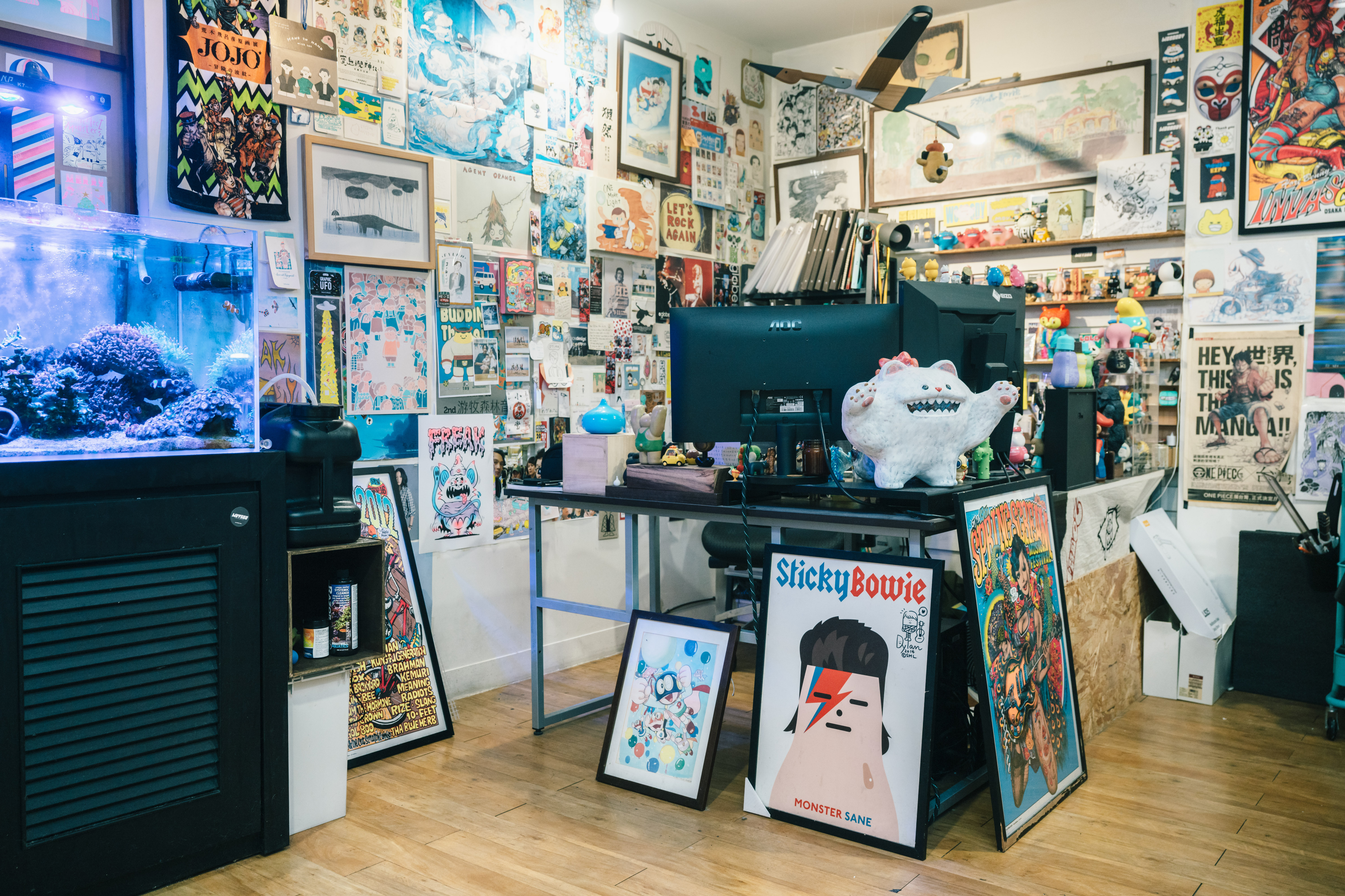 圖說:工作室裡貼滿插畫、動漫與電影海報,五顏六色的公仔佔滿每個角落與牆面,問他有多少蒐藏?他笑說,數不清了。