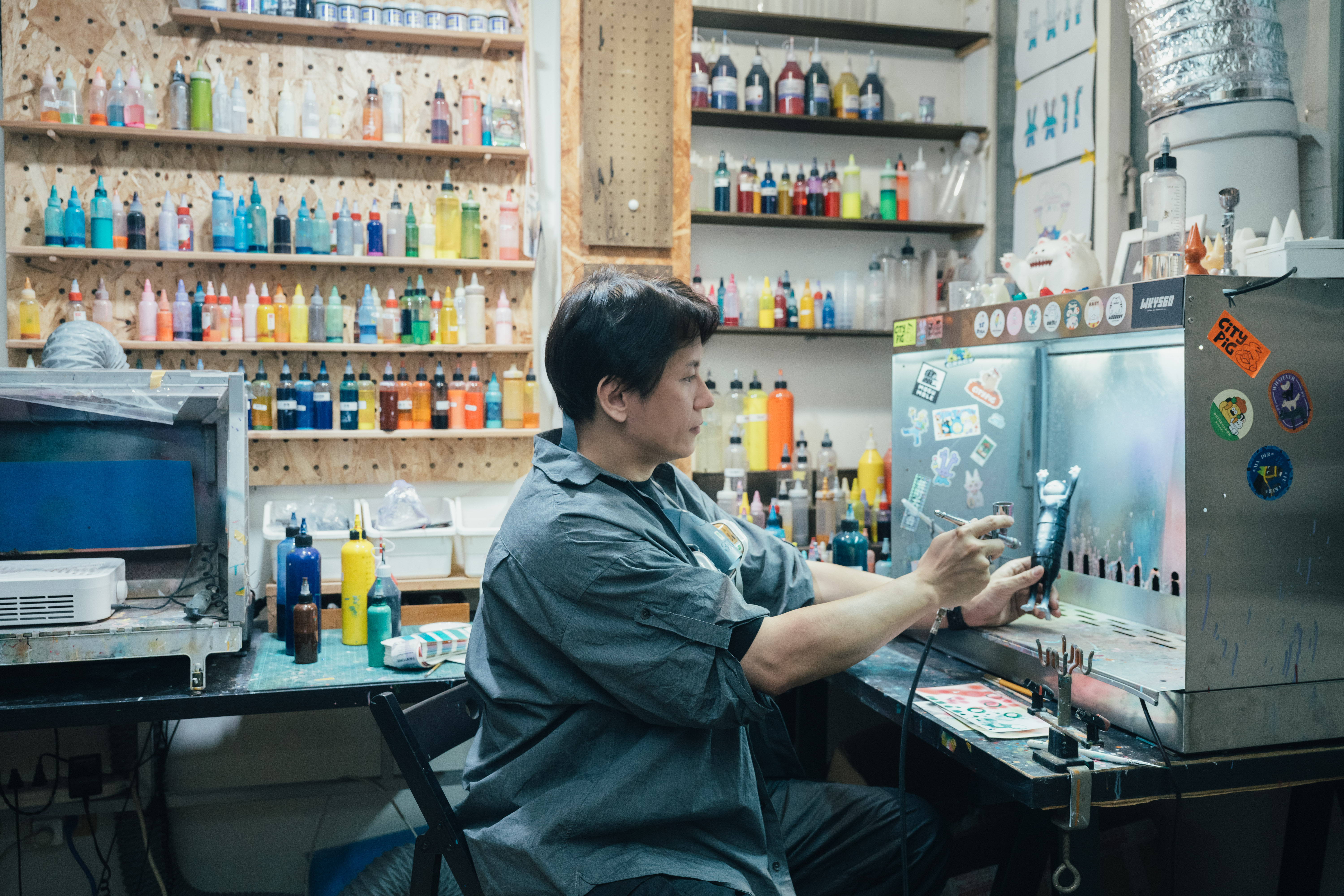 在工作室的後方,是專門製作玩具公仔的房間,打開那扇門,就能進入Dylan的創作夢奇地:「貓的抱抱」誕生的地方。裡頭放著大大小小的機具,五顏六色的顏料和許多的加工道具隨侍在牆,一群一群仍是半成品的玩具們靜靜躺在展架上,彷彿夜裡將要上演他最愛的逐格動畫電影《聖誕夜驚魂》的故事情節⋯⋯