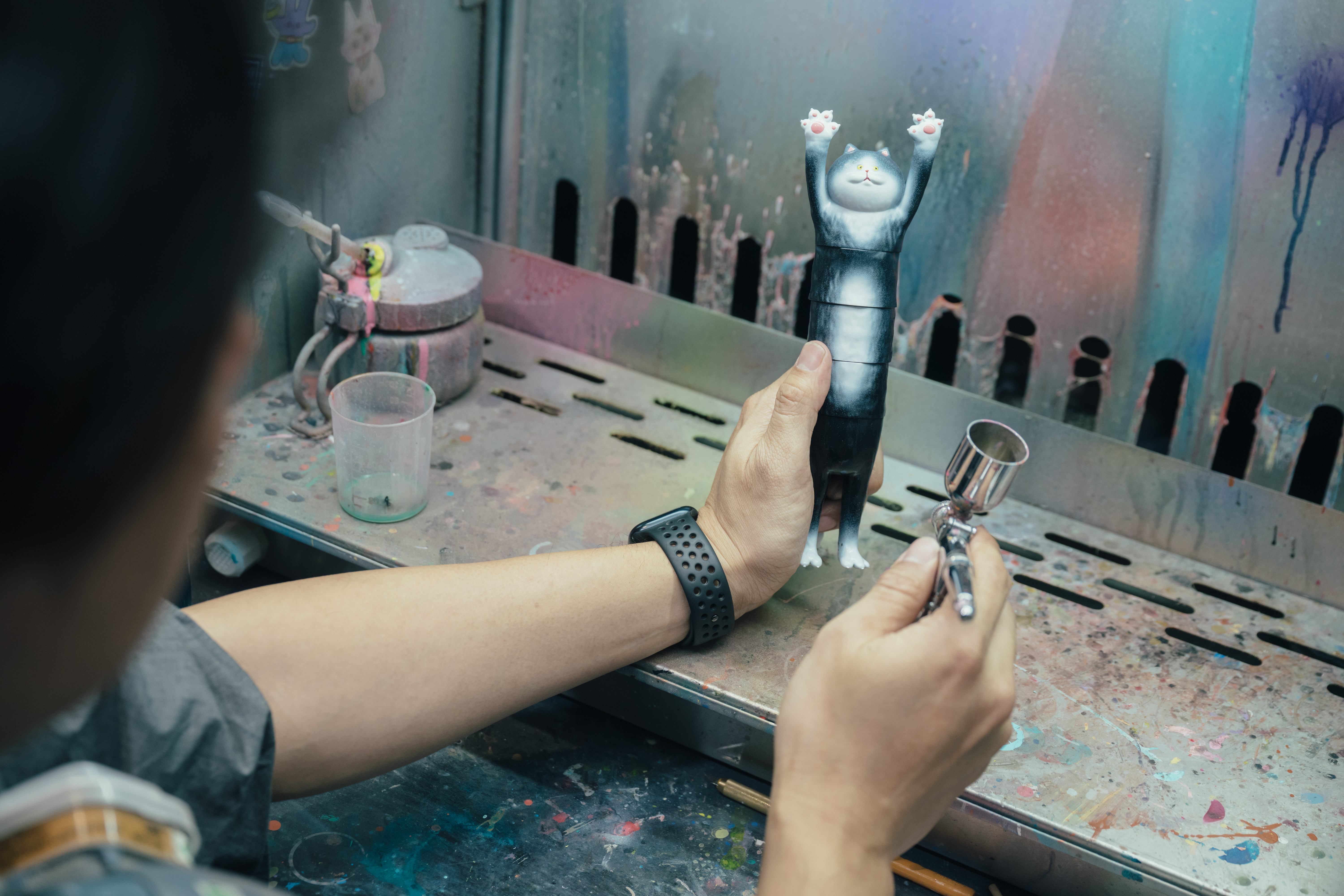 手中拿著「貓的抱抱」的原型——20公分高的大型軟膠公仔——Dylan老練地示範著手工噴色的效果,一層層疊出看起毛茸茸的「漸層」毛色,「一切都是從一張隨手草稿開始,雖然是採用電腦 3D 建模,但為了保留親手雕琢的溫潤感,在外觀肌理上反覆修改,終於在 2022 年讓它正式誕生。」考量到貓咪總愛伸懶腰的特性,他也賦予這系列的軟膠玩具更多可玩性與變化,讓貓咪公仔的身體可以「無限增長」,還能換成蛇身般的旋轉腰身,擺出側身橫躺的詭譎姿勢。他笑說,參展出攤時,連日本人看到這樣的設計都覺得很驚奇,有些人還會模仿「貓的抱抱」的姿勢,舉起雙手跟公仔們合照!