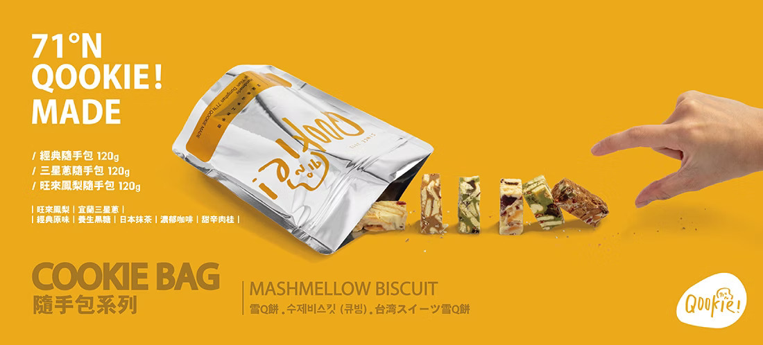 Qookie!は、地元・彰化産の厳選された土パイナップルを使用。甘みが強いゴールデンパイン70%と、酸味のある土パイン30%を絶妙にブレンドし、台湾の伝統菓子「鳳梨酥(パイナップルケーキ)」のような味わいを再現。手作りのQ餅(ヌガー)のもちもち食感とともにお楽しみいただけます。120gの個包装で、風味をしっかりキープ。